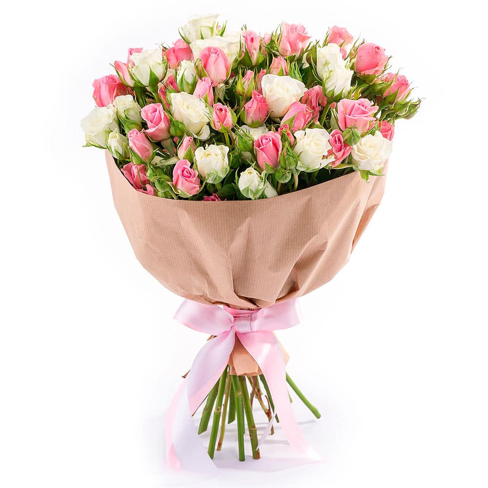 Этот букет из розовых и белых кустовых роз создаёт атмосферу нежности и романтики. В составе букета — розы кустовые микс, белые и розовые. Упакован в крафт-бумагу и украшен розовой атласной лентой. Композиция придаёт уют и гармонию любому пространству. Прекрасно подойдёт для поздравления любимой на День Святого Валентина.