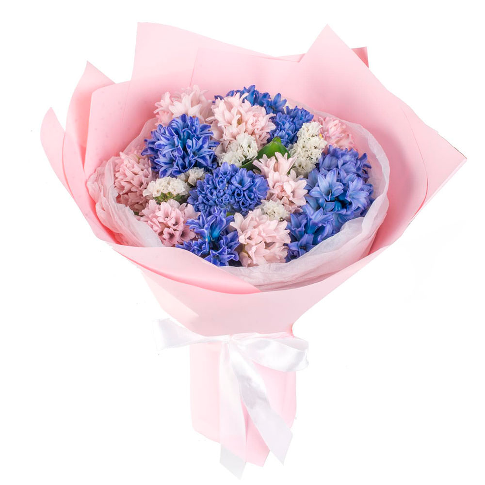 Эта нежная композиция в розовых и голубых тонах создаёт атмосферу лёгкости и романтики. В букете собраны гиацинты и статица, которые подчёркивают его изысканность. Упакован в розовую матовую плёнку с белой атласной лентой, завязанной в элегантный бант. Такой букет идеально подойдёт для поздравления сестры на День Святого Валентина.