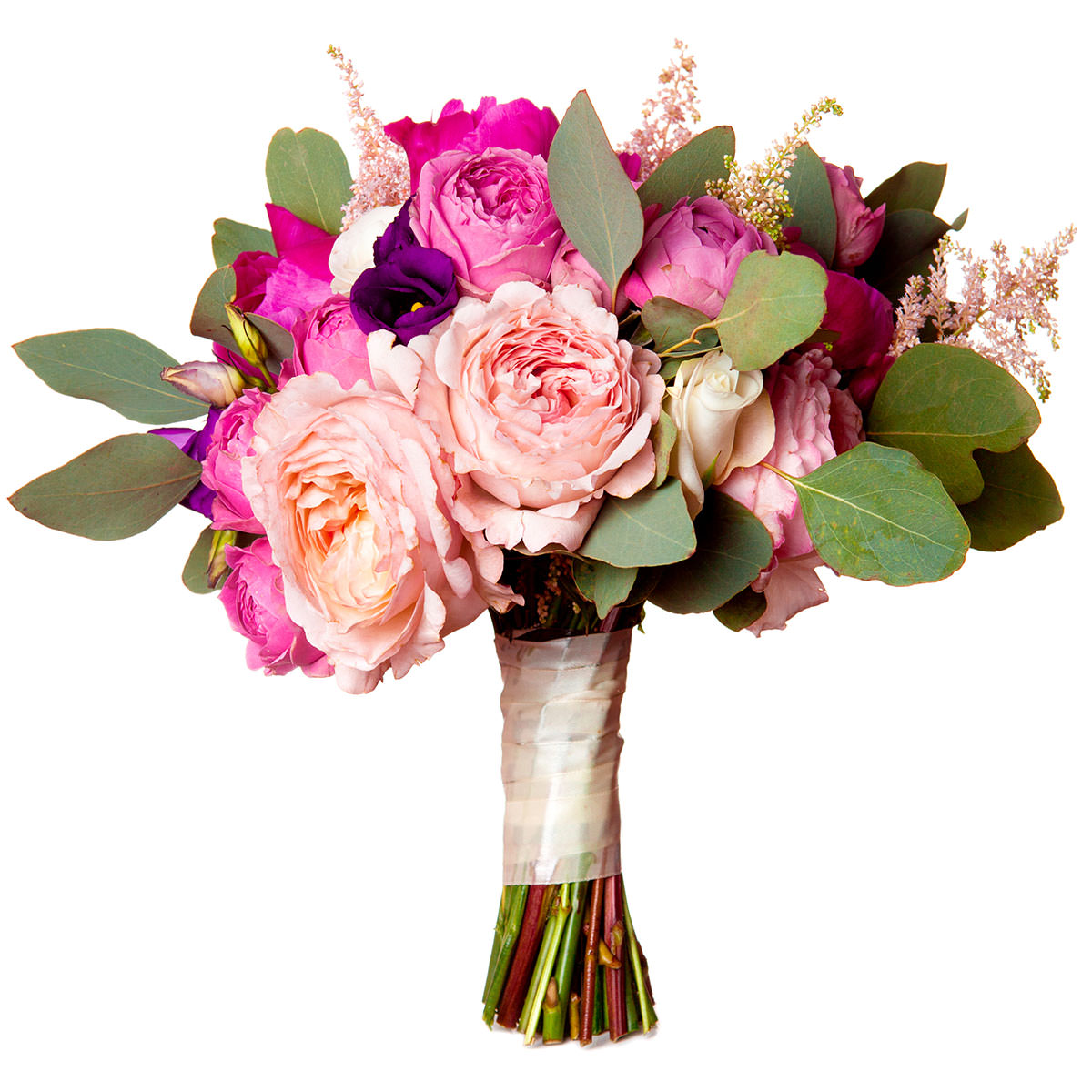 Пион розовый, эустома фиолетовая, роза одноголовая белая, эвкалипт, солидаго. Упаковка (лента, пленка, крафт, сетка, пленка матовая)