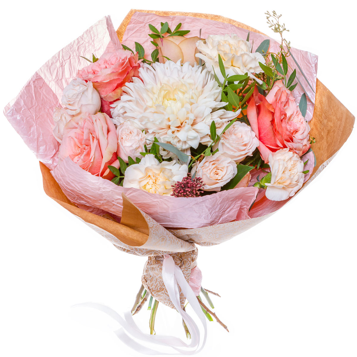 Нежные розовые оттенки создают атмосферу лёгкой романтики. В составе букета одноголовая розовая хризантема, розовая роза, кустовая розовая гвоздика и озотамнус, дополненные зеленью фисташки. Букет оформлен в крафт-бумагу и розовую матовую плёнку, перевязанную белой лентой. Эта композиция наполнит помещение уютом и теплом, идеально подойдет для поздравления коллеги на повышение.