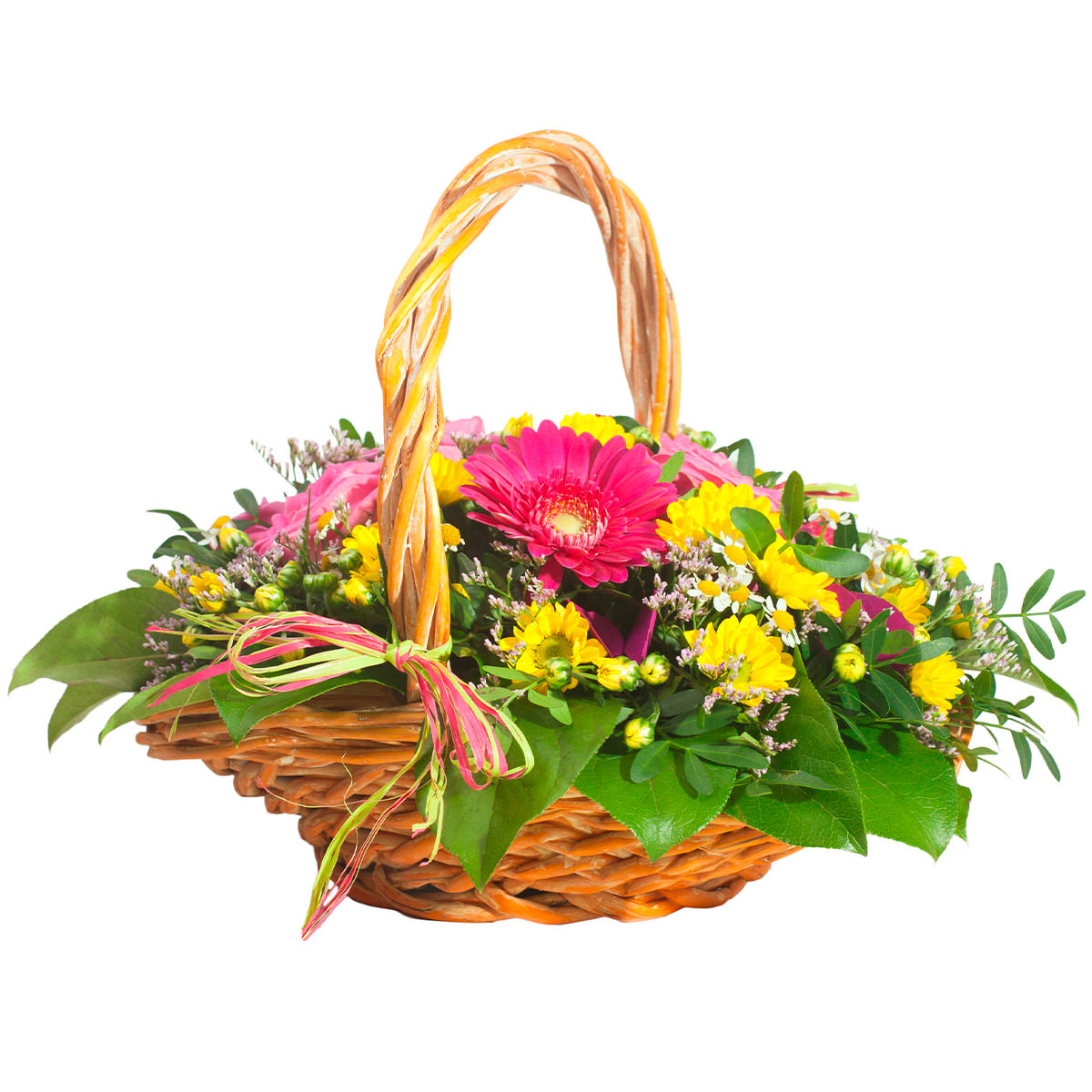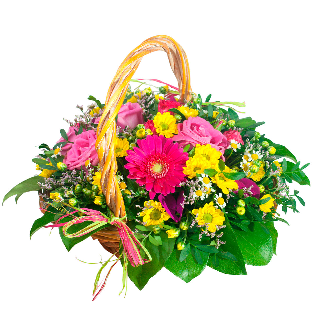 Яркие розовые и жёлтые оттенки создают солнечное настроение. В состав входят розовая гербера, жёлтая хризантема кустовая, ромашка и лимониум. Плетёная корзина с декоративной лентой добавляет композиции изысканности. Эта цветочная композиция подарит атмосферу радости и уюта, идеально подойдёт для благодарности учительнице.