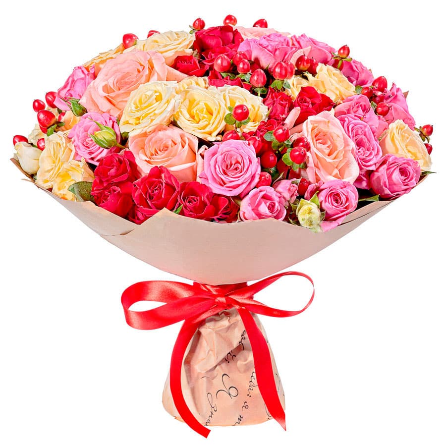Яркие оттенки розового, красного и кремового создают атмосферу праздника и радости. В составе роза одноголовая розовая, кустовая роза микс в красных, розовых и кремовых тонах, а также гиперикум. Упакован в крафт-бумагу с рисунком и украшен красной атласной лентой, завязанной бантом. Этот букет добавит романтики в ваш вечер и станет отличным подарком для любимой женщины на годовщину.