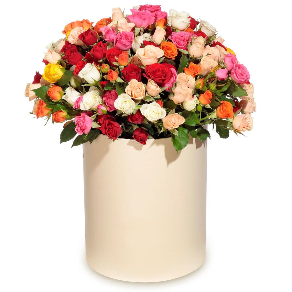 Яркие краски кремовых, оранжевых, красных и розовых кустовых роз создают атмосферу радости. Восхитительное сочетание цветов в шляпной коробке. Коробка кремового цвета гармонично подчёркивает изысканность композиции. Идеально для поздравления с юбилеем, особенно для любимой женщины.