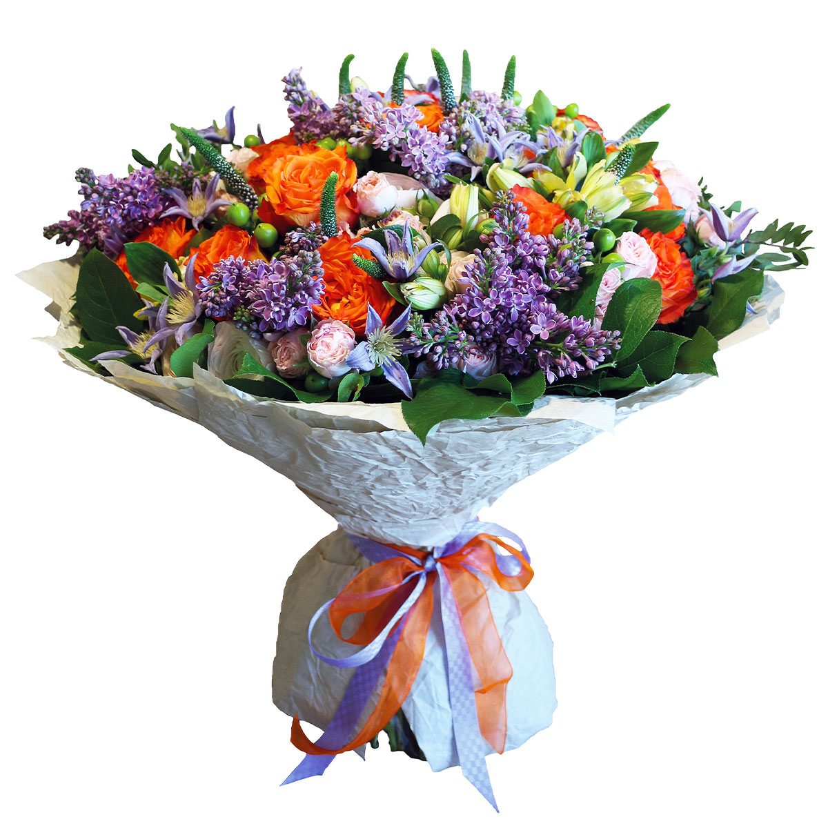 Яркие оранжевые и розовые оттенки розы в сочетании с нежной сиренью и фиолетовым клематисом создают атмосферу радости и свежести. Букет включает в себя одноголовую оранжевую розу, кустовую розовую розу, сирень, веронику, клематис и гиперикум. Упаковка представлена в виде крафт-бумаги с матовой плёнкой и украшена яркой лентой. Он станет прекрасным подарком на День Святого Валентина для любимого человека.