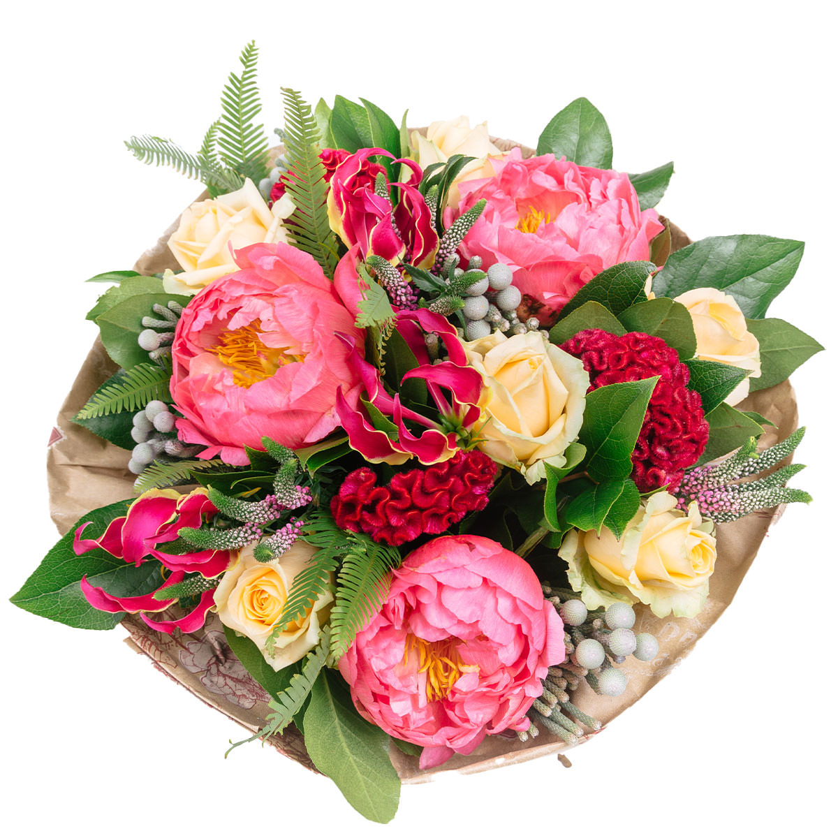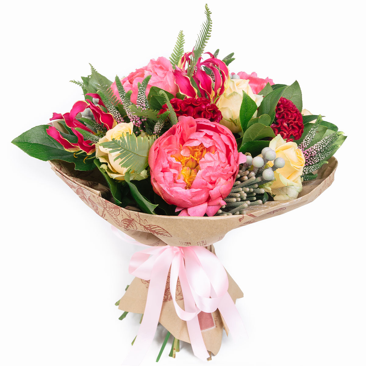 Теплые коралловые и кремовые оттенки букета создают атмосферу умиротворения. Пион коралловый, роза кустовая чайная, целозия гребенчатая, бруния, вероника и аспидистра гармонично сочетаются, формируя изысканную композицию. Букет оформлен в крафт-бумагу с рисунком и перевязан светло-розовой атласной лентой. Эта композиция подарит уют и станет идеальным подарком на День Святого Валентина для любимой.