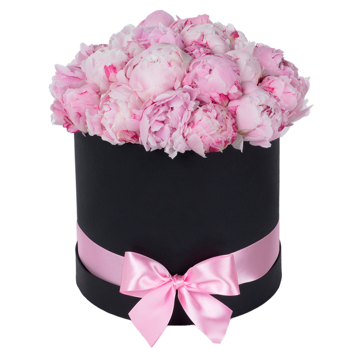 Эта композиция из нежных розовых пионов создаёт атмосферу романтики и уюта. Пионы аккуратно размещены в чёрной шляпной коробке с розовой атласной лентой, завязанной бантом. Такой букет станет идеальным подарком для любимой женщины на День святого Валентина.