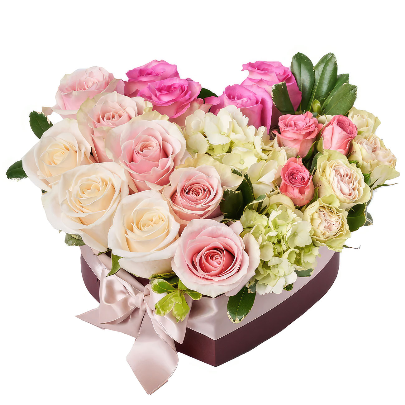 Этот нежный букет в пастельных тонах вызывает чувство умиротворения и радости. Розы одноголовые розового микса, кустовые розы розовые и кремовая гортензия создают гармоничную композицию. Упаковано в элегантную коробку в форме сердца, украшенную атласной лентой. Создает романтическую атмосферу, идеально подходит для подарка на помолвку для любимой.