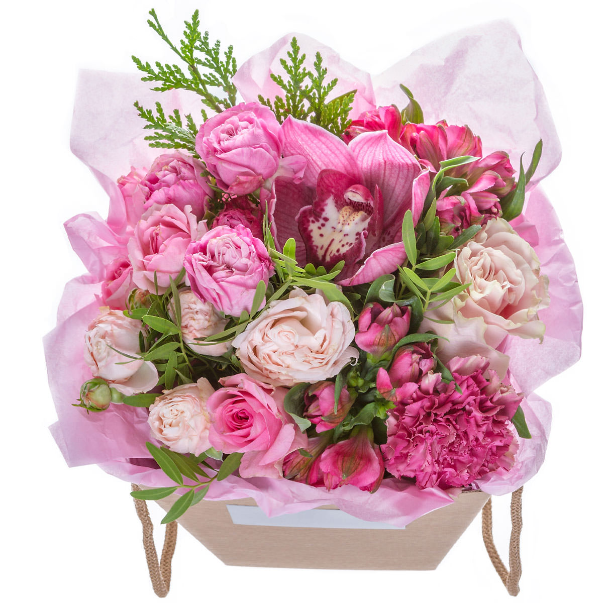 | Состав | Розы, Гвоздики, Альстромерии, Орхидеи, Пионы |