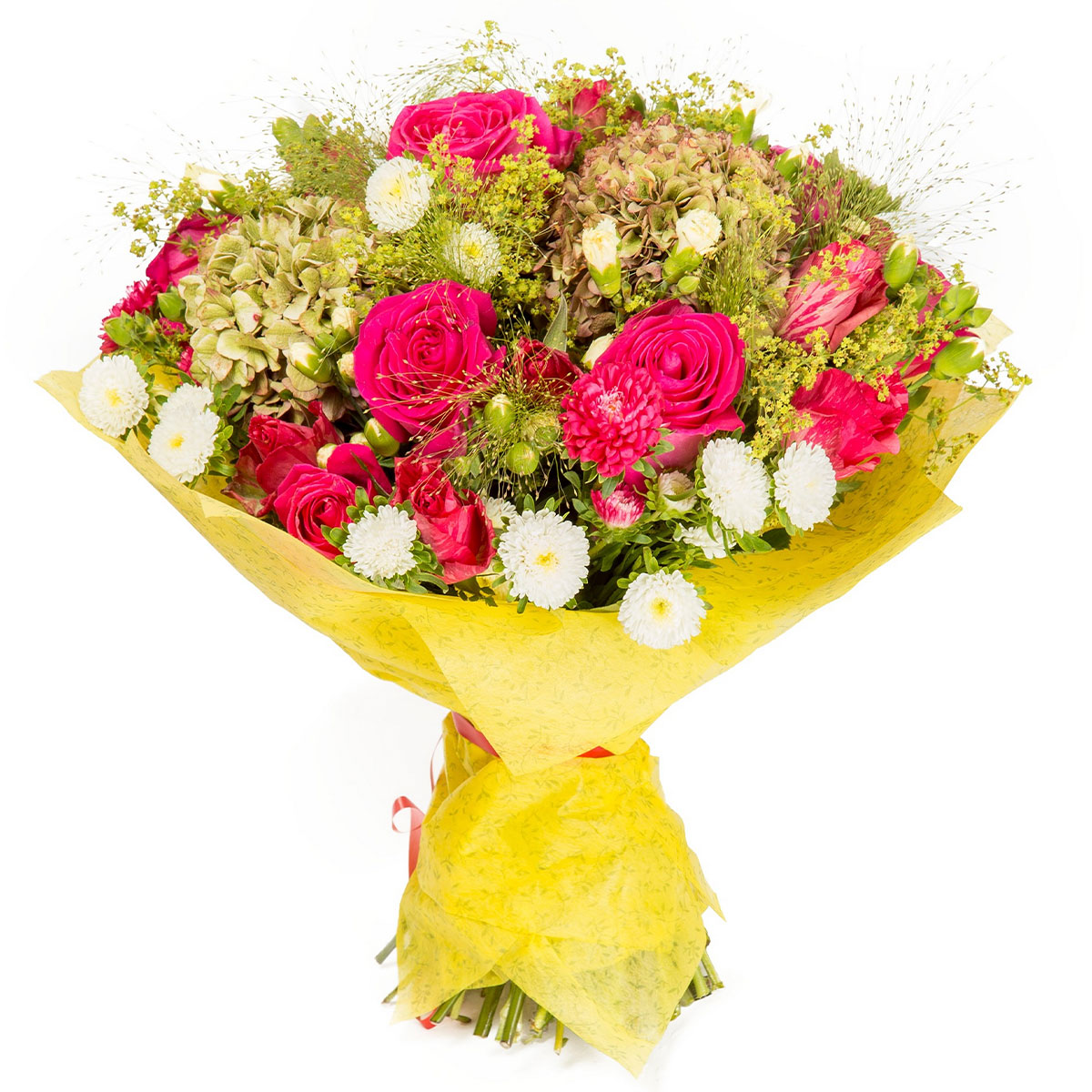 Яркие розовые и зеленые оттенки создают атмосферу нежности и свежести. Букет включает розу одноголовую розовую, гортензию зеленую, маргаритку белую и зелень. Упакован в жёлтую бумагу с декоративной фактурой и перевязан красной лентой. Подходит для романтического вечера, станет прекрасным подарком для любимой.